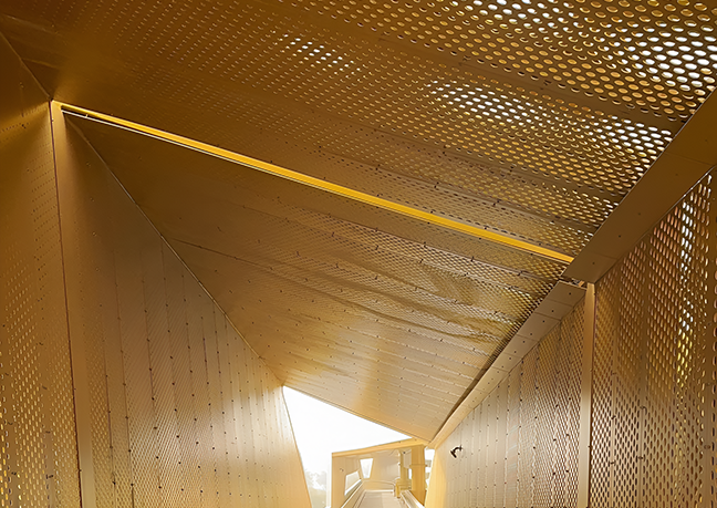 A modern, urban experience ideal for casual walks and light exercise featuring wide, well-designed sidewalks, pedestrian bridges, and open plazas surrounded by striking architecture.